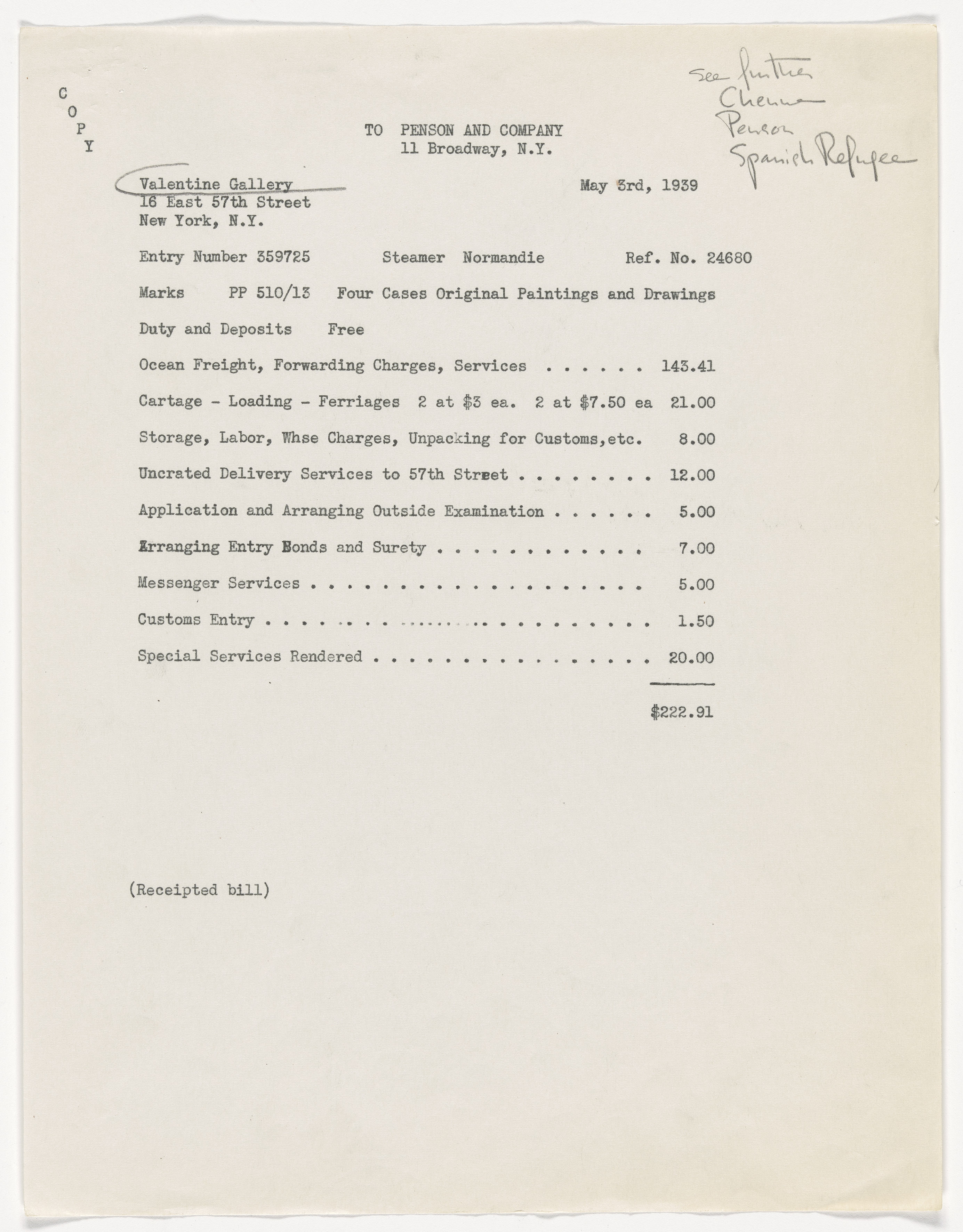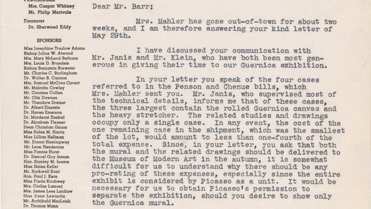 Correspondencia en la que se adjuntan los gastos de envío de Guernica de París a Nueva York, 1939.