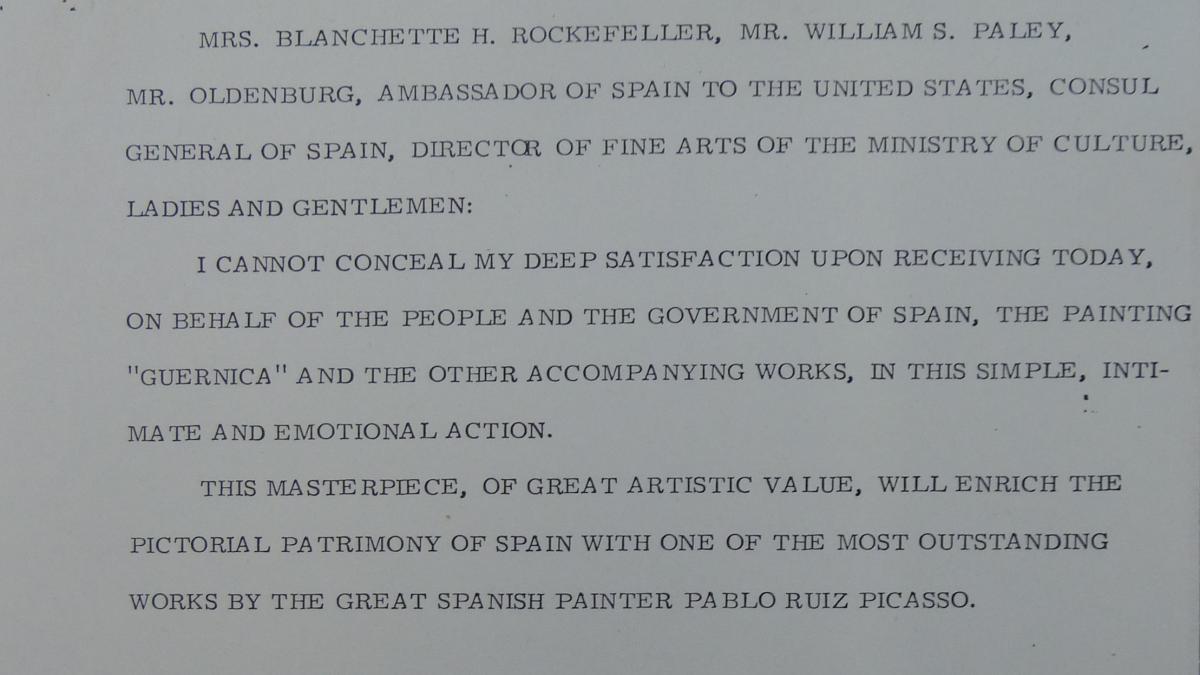 Iñigo Cavero, ministro de Cultura y representante de la delegación española, afirma en su discurso que es una grata coincidencia que Guernica llegue a España en el aniversario del nacimiento de Picasso, que será conmemorado con una exposición organizada por su Ministerio.