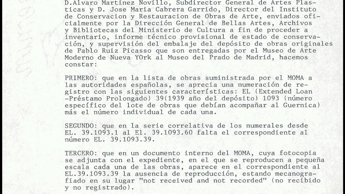 Documento sobre la discrepancia en el inventario de las obras entregadas por Picasso al Moma y las recibidas por España.
