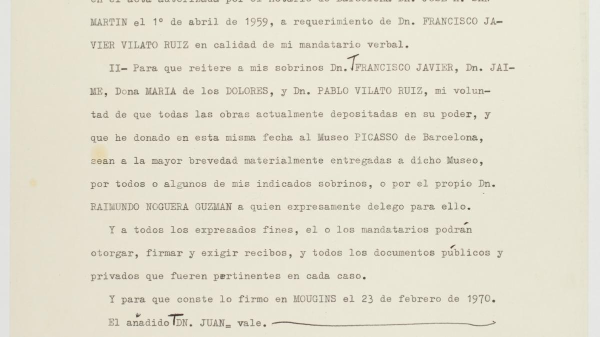 Documento firmado por Pablo Picasso sobre la donación de sus obras de juventud conservadas por su familia