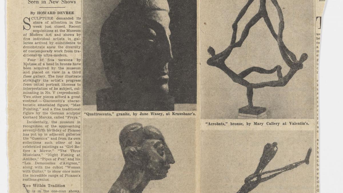 Howard Devree, «Sculpture contrast. Contemporary range seen in new shows». The New York Times, 20 de marzo, 1955.