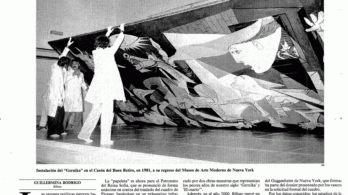 Guillermina Rodrigo, «El PNV obtiene el compromiso del PP para el traslado temporal del "Gernika" a Bilbao», La Vanguardia, 14 de junio de 1997, p. 45.