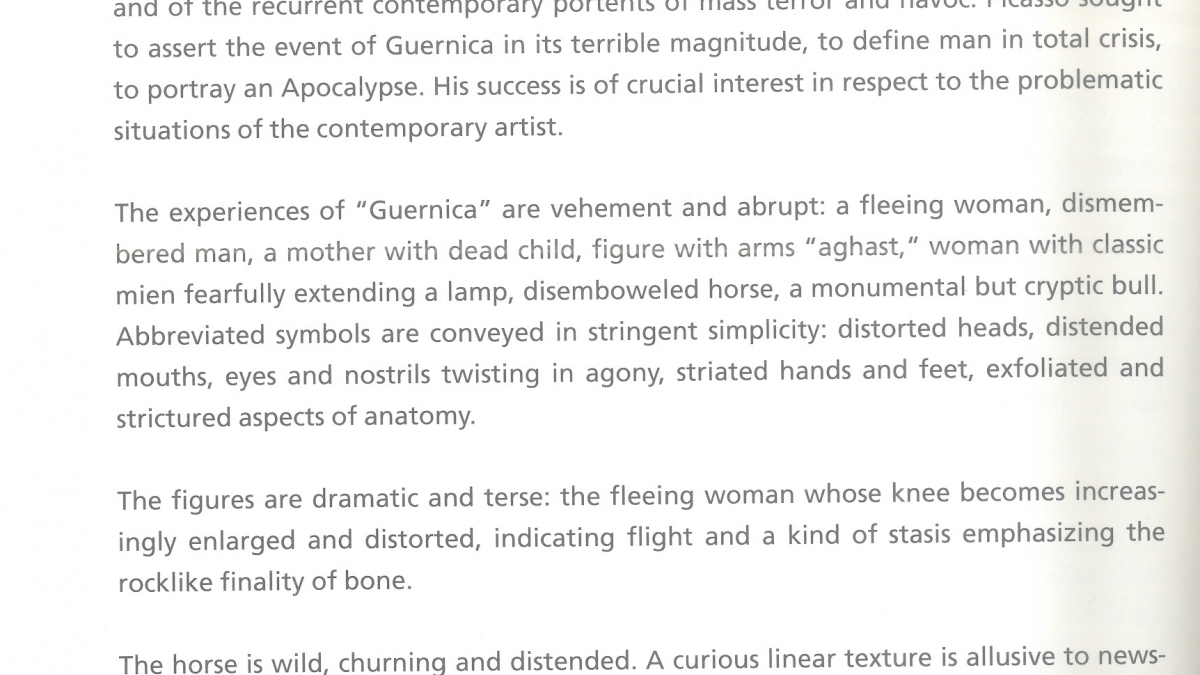 El artista Leon Golub escribió en 1958 este texto sobre un manuscrito europeo del siglo XI, conocido como Apocalipsis de Saint-Sever, que podría haber servido a Pablo Picasso de fuente formal y simbólica para Guernica. Como muchos otros artistas de la escena estadounidense, Golub estaba fascinado por Guernica. Otro ejemplo fue Jackson Pollock, cuya serie Drawings Presented for Psychoanalysis [Dibujos presentados para el psicoanálisis, ca. 1939-1940] tiene claros ecos de los estudios preparatorios del cuadro de Picasso, y su Mural (1943) es, sin duda, una versión abstracta del mismo. Para Golub, la obra del artista español ejemplificaba un gran compromiso, dentro de la tradición figurativa europea, con temas sociales y políticos sin caer en un análisis político o en la representación de un ideal particular, como sí ocurría en la corriente del realismo social estadounidense de la década de 1930 o en el realismo socialista oficial de la Unión Soviética y sus partidarios comunistas en Europa.