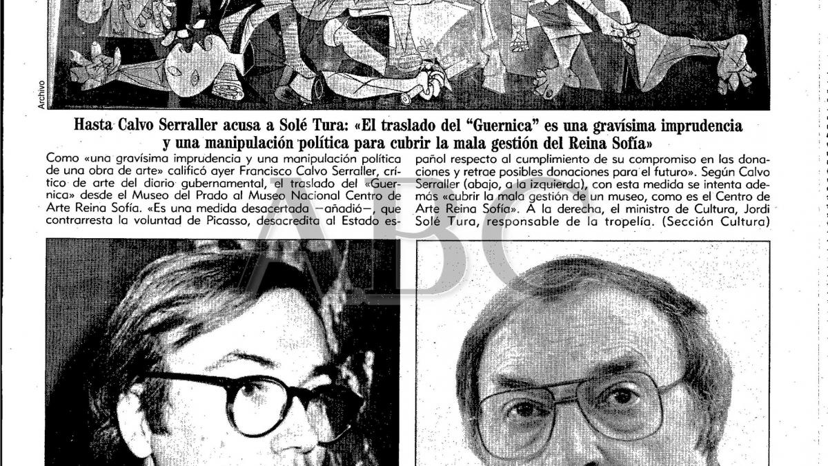 «Hasta Calvo Serraller acusa a Solé Turá: el traslado del Guernica es una gravísima imprudencia y una manipulación política para cubrir la mala gestión del Reina Sofía», ABC, 7 de julio de 1992, p. 11