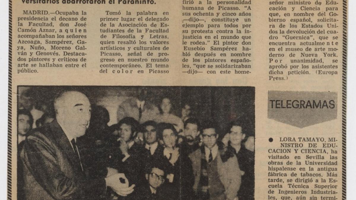 El Alcázar, 28 de noviembre, 1966. Reseña del homenaje de la Facultad de Filosofía y Letras de Madrid a Pablo Picasso con motivo de su 85 cumpleaños en el que se dieron cita destacados pintores y críticos de arte para hablar de su obra y su figura, y en el trancurso del cual se propuso dirigir una moción al ministro de Educación y Ciencia para reclamar Guernica a Estados Unidos.