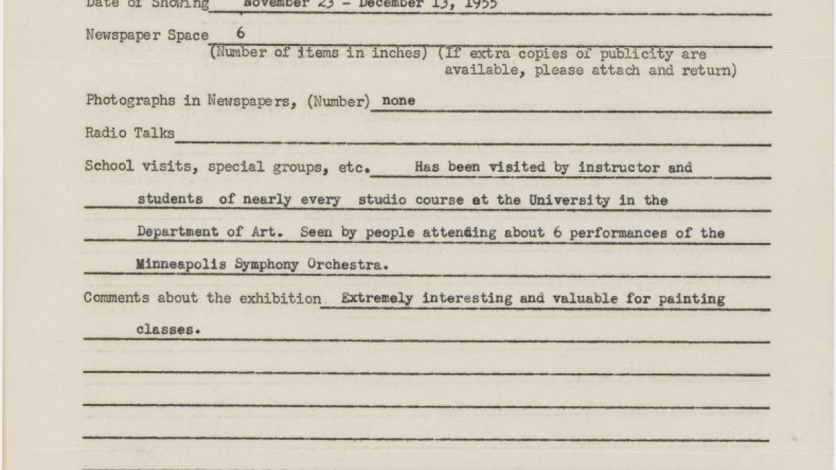 Informe de impacto de público de la exposición Studies for Guernica en la University of Minnesota Gallery dirige al Departamento de Exposiciones Itinerantes del Museum of Modern Art de Nueva York