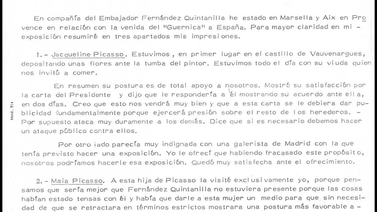 Informe de Javier Tusell, director general de Bellas Artes, sobre su viaje a Francia y la visita a los herederos de Pablo Picasso