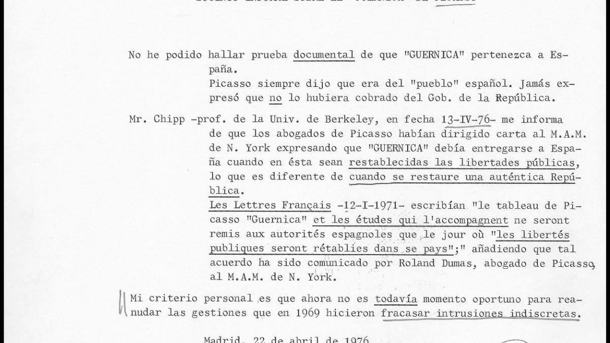 Informe de Joaquín de la Puente sobre la propiedad de Guernica y las posibilidades de negociación con el Museum of Modern Art de Nueva York