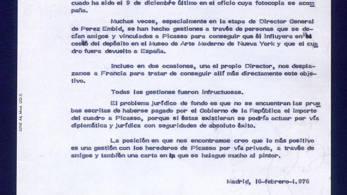 Dirigido por correspondencia interna al director general de Patrimonio Artístico en la que se explica que el problema para recuperar Guernica es que no se encuentra el recibo del Gobierno de la República y se insta a intentar recuperar el cuadro a través de los herederos de Picasso.