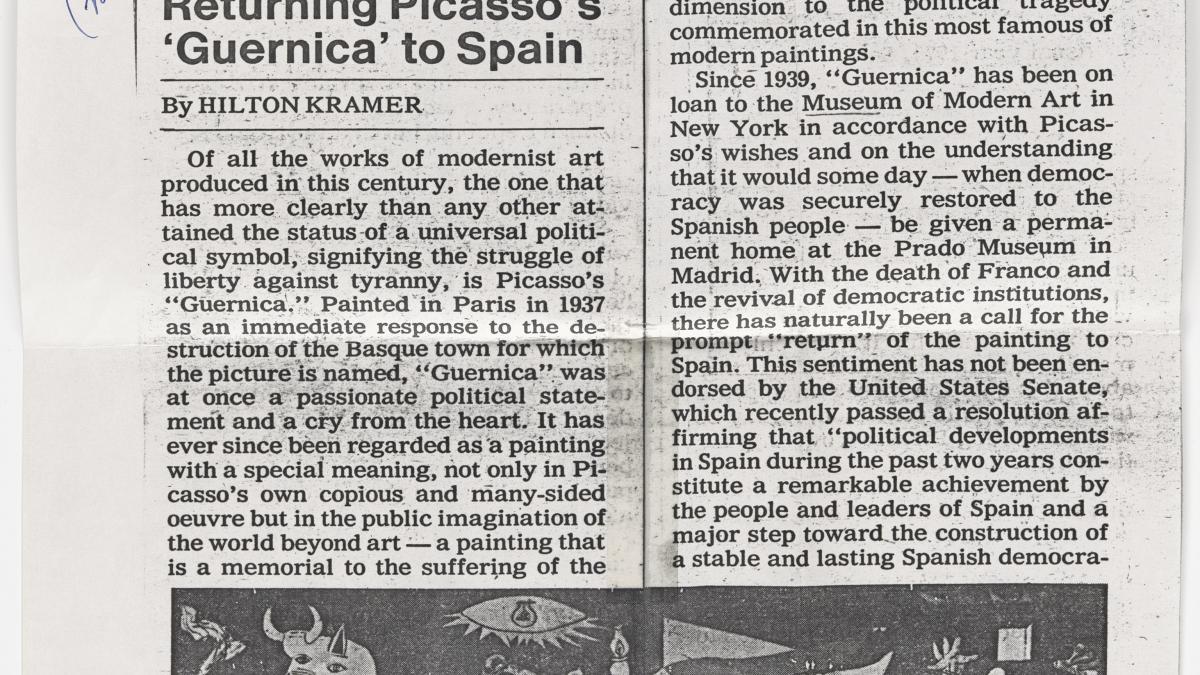 Hilton Kramer, «Returning Picasso's Guernica to Spain», The New York Times, 1978, pp. 27 y 29.