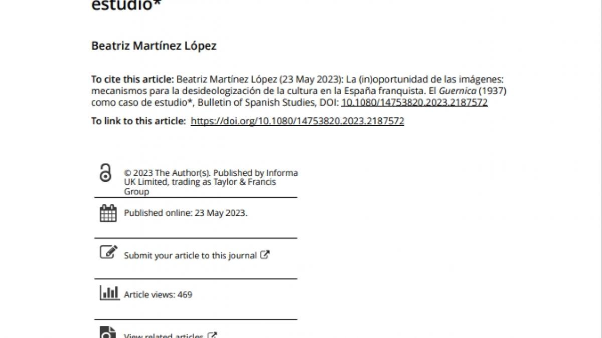 En el marco del Proyecto de Investigación I+D+i Rostros y rastros en las identidades del arte del franquismo y el exilio, este trabajo de Beatriz Martínez López analiza Guernica desde la perspectiva del proceso de despolitización mediante el cual la obra fue incorporada al imaginario colectivo español. El estudio examina los mecanismos empleados para ese fin, que tendieron a ignorar el contexto geopolítico e histórico en el que Picasso concibió la obra.
