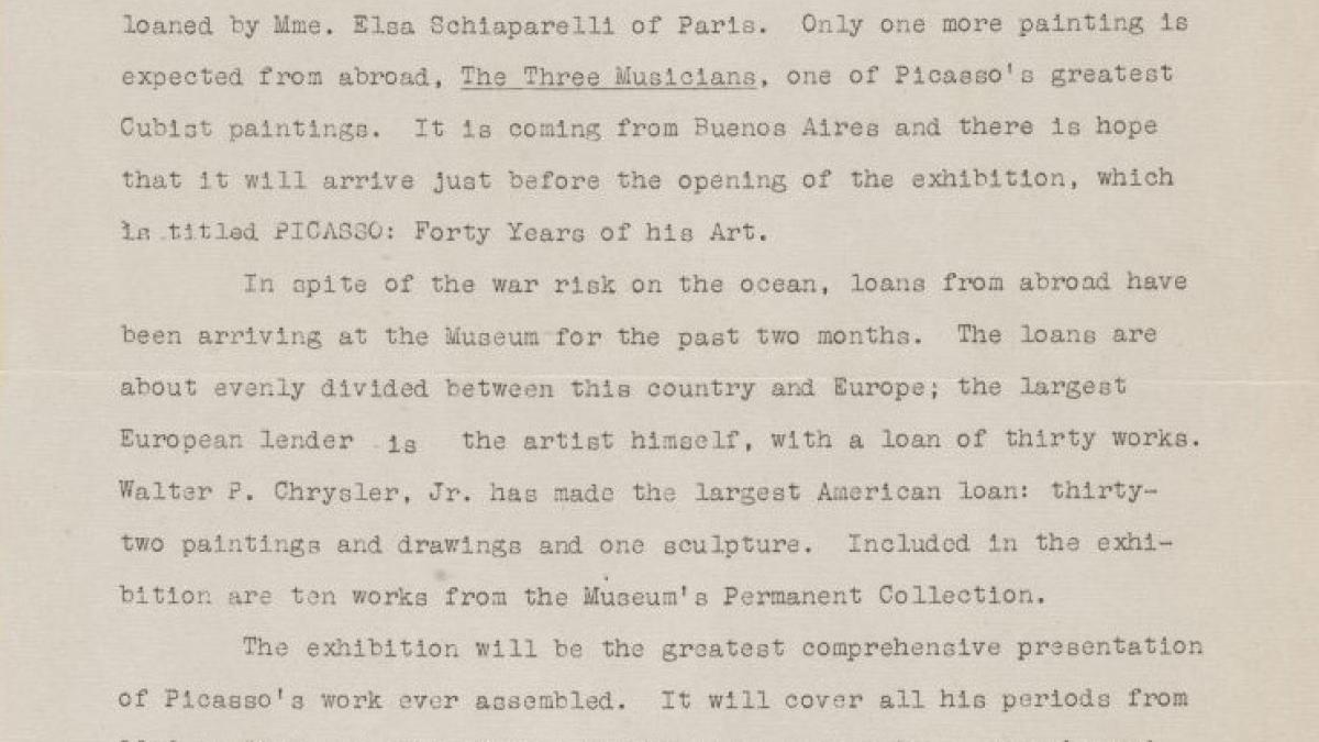 Las últimas obras de Picasso llegan de Europa a tiempo para la gran exposición del Museum of Modern Art