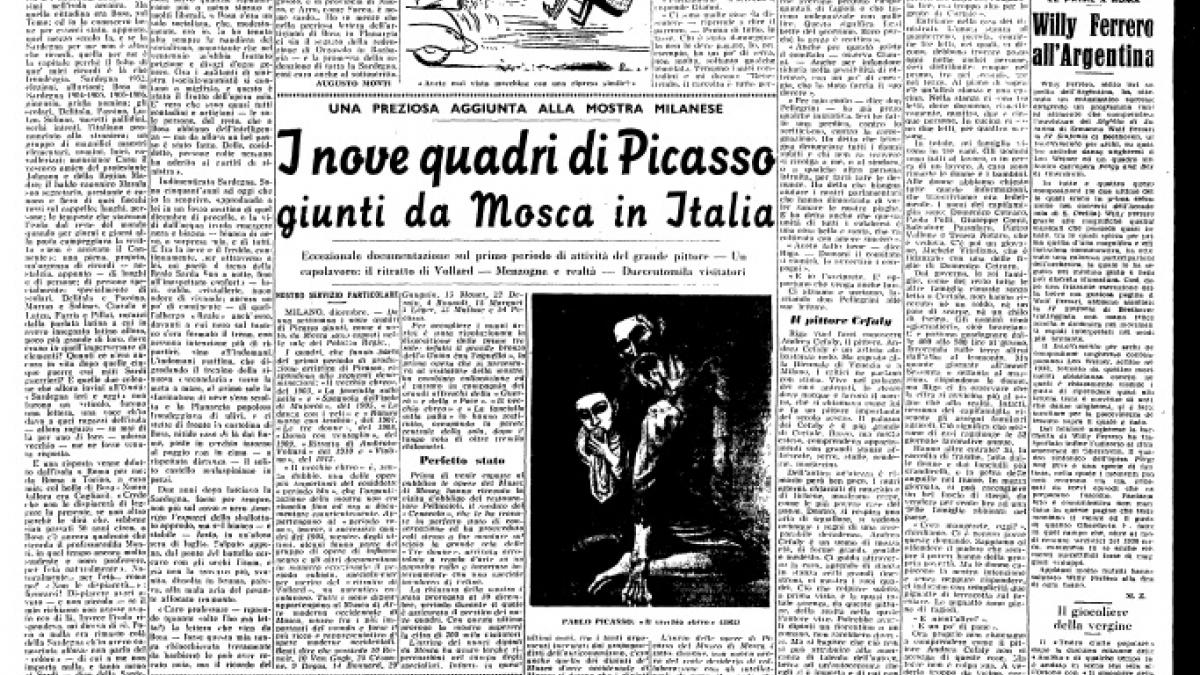 El artículo "I nove quadri di Picasso giunti da Mosca  in Italia" se publicó en l´Unità (lunes, 14 de diciembre de 1953, p. 7) con motivo de la ampliación de la exposición Picasso celebrada en el Palazzo Reale de Milán con nueve cuadros procedentes del Museo de Moscú. Por ese motivo, y por la presentación también de Guernica entre octubre y comienzos de diciembre,  esta exposición resultó excepcional y diferente respecto a la muestra de Roma.