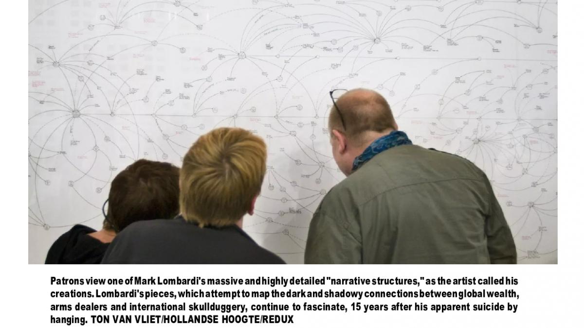 Mark Lombardi produjo dibujos de gran formato en los que detallaba lo que llamó las “estructuras narrativas” y la constelación de conexiones entre la riqueza mundial, los traficantes de armas y las acciones encubiertas sin escrúpulos de políticos y agentes gubernamentales. Durante la guerra de Vietnam, los manifestantes contrarios al conflicto establecieron conexiones similares. Este artículo de Newsweek aborda la carrera de Lombardi y la lucidez de sus proyectos de arte, que revelan los flujos de poder y corrupción de los intereses estadounidenses, tanto nacionales como internacionales. La postura crítica de Lombardi y su interés por descubrir y representar dichas conexiones causales a menudo ocultas y abstractas llevaron a algunos a considerar su muerte, quince años antes de este artículo, no como un suicidio sino como el resultado de una conspiración.
