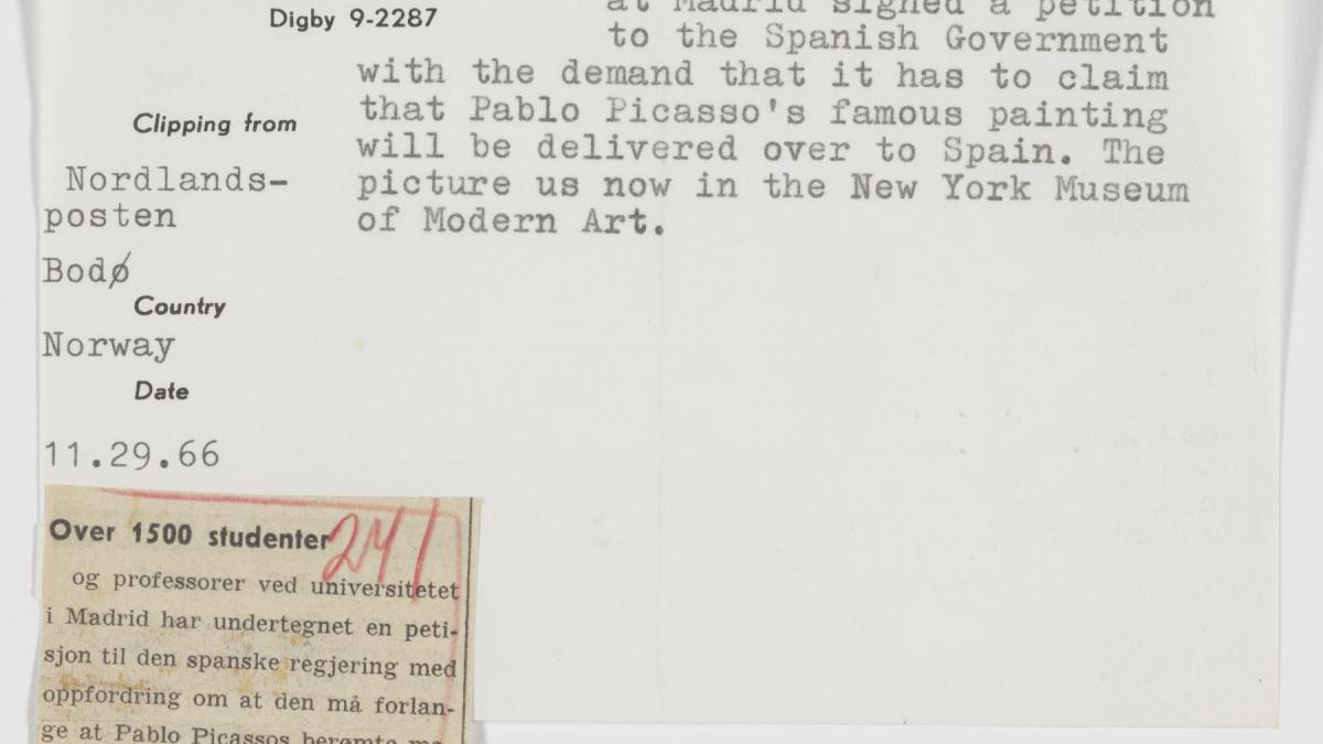 Recorte de prensa del Nordlands-posten Bodo (Noruega), del 29 de noviembre de 1966, sobre la petición presentada por estudiantes y profesorado de la Universidad en Madrid para el retorno del Guernica a España.