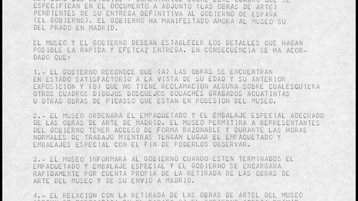 Transcripción del acuerdo de entrega de Guernica firmado con el Museum of Modern Art de Nueva York dirigido a Javier Tusell, director general de Bellas Artes.