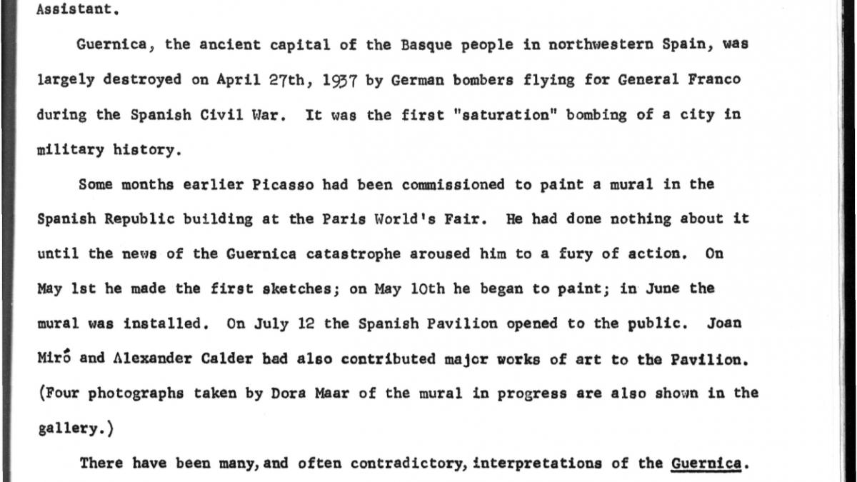 Esta “apolítica” nota de prensa sobre Guernica, un cuadro que representa las consecuencias atroces de la guerra, acompañaba el prólogo de Alfred H. Barr Jr. en el catálogo de la exposición del MoMA Guernica: Studies and Postscripts (2 de junio, 1967-13 de febrero, 1968). La nota reproduce una declaración de Pablo Picasso sacada de contexto en la que afirma que la obra carece de un “significado político explícito”. La exposición tuvo lugar en mitad de la escalada de protestas en EE. UU. contra la guerra de Vietnam.