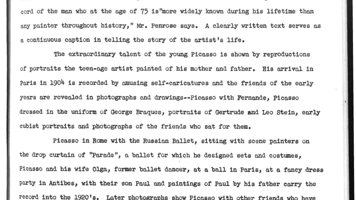 Nota de prensa sobre la publicación de Portrait of Picasso, de Roland Penrose