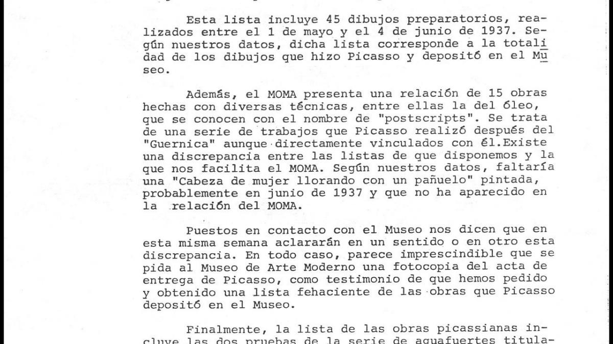 Nota recordatoria de la Dirección General de Bellas Artes, Archivos y Bibliotecas en relación a la llegada de Guernica a España