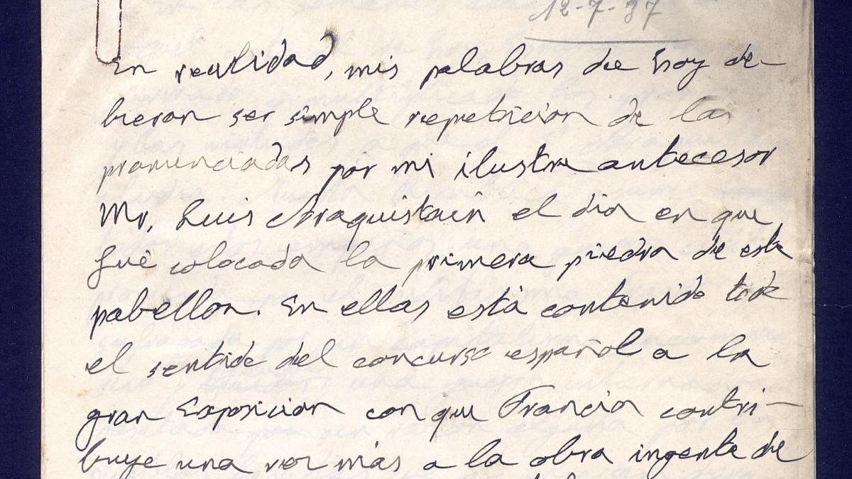 Notas del discurso de la recepción en la embajada con motivo de la inauguración del Pabellón de España