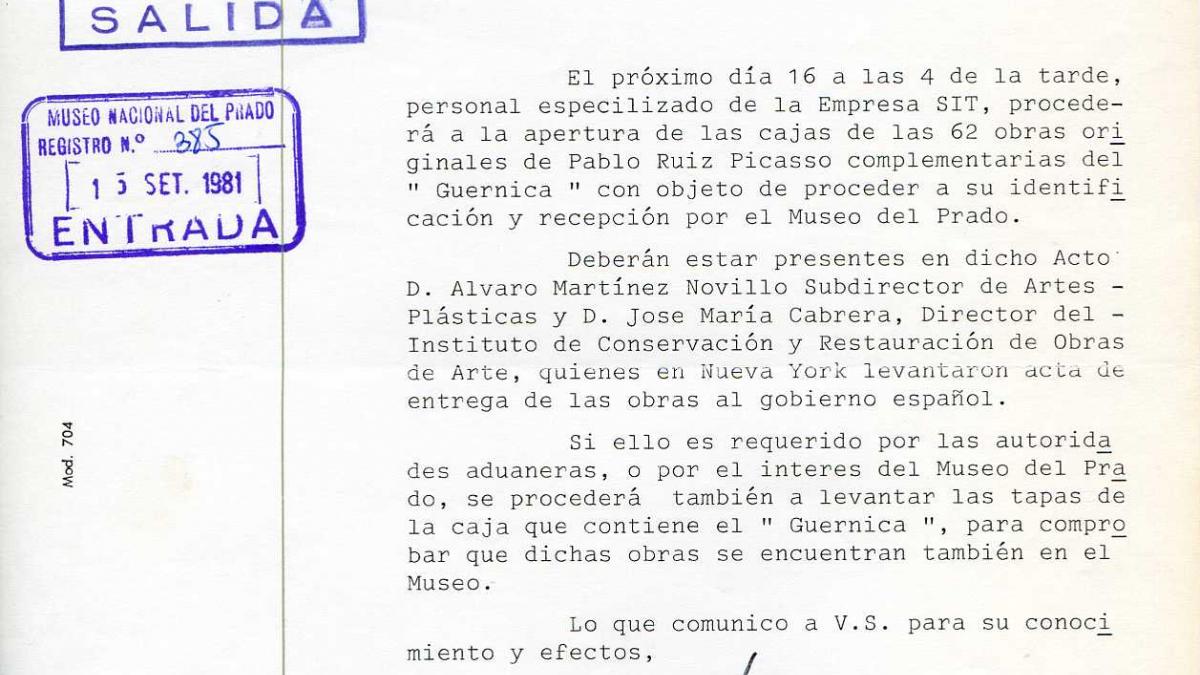 Oficio de la Dirección General de Bellas Artes Archivos y Museos a José Manuel Pita Andrade, director del Museo del Prado, sobre el procedimiento para la identificación y la recepción en el museo de 62 obras originales de Pablo Ruiz Picasso complementarias de Guernica.