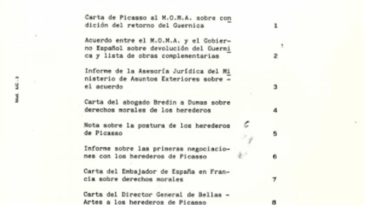 Expediente que incluye diferentes documentos sobre el traslado de Guernica al Museo Reina Sofía, como la carta de Picasso mecanografiada dirigida al Museum of Modern Art de Nueva York, las actas del Real Patronato del Museo del Prado del 22 de marzo de 1988, el informe sobre la situación jurídica de las obras que integran la colección de arte del siglo XX del Museo Nacional del Prado, entre otros.