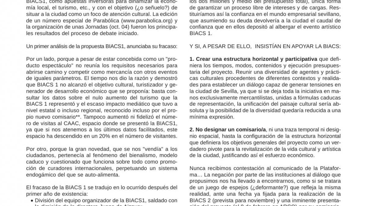 Este comunicado detalla el origen de la Plataforma de Reflexión sobre Políticas Culturales (PRPC) de Sevilla, fundada a partir del número especial de Parabólica de noviembre de 2004 y la celebración de unas jornadas destinadas a cuestionar la primera edición de la Bienal Internacional de Arte Contemporáneo de Sevilla (BIACS 1, 1 de octubre-26 de diciembre, 2004). Preocupados por los efectos del “bienalismo” como sistema, los autores de este comunicado incluyen también un manifiesto que alude a la segunda edición de la BIACS (26 de octubre, 2006-15 de enero, 2007), que estuvo comisariada por Okwui Enwezor, así como los nombres de los primeros artistas y agentes culturales en sumarse a estas reivindicaciones.