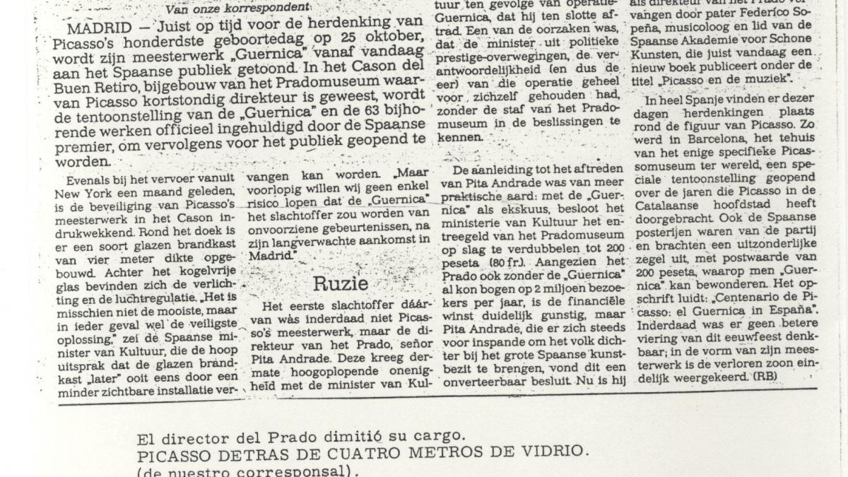 «Picasso achter 4 meter glas», Der Standaarel, 26 de octubre, 1981 (original y traducción).