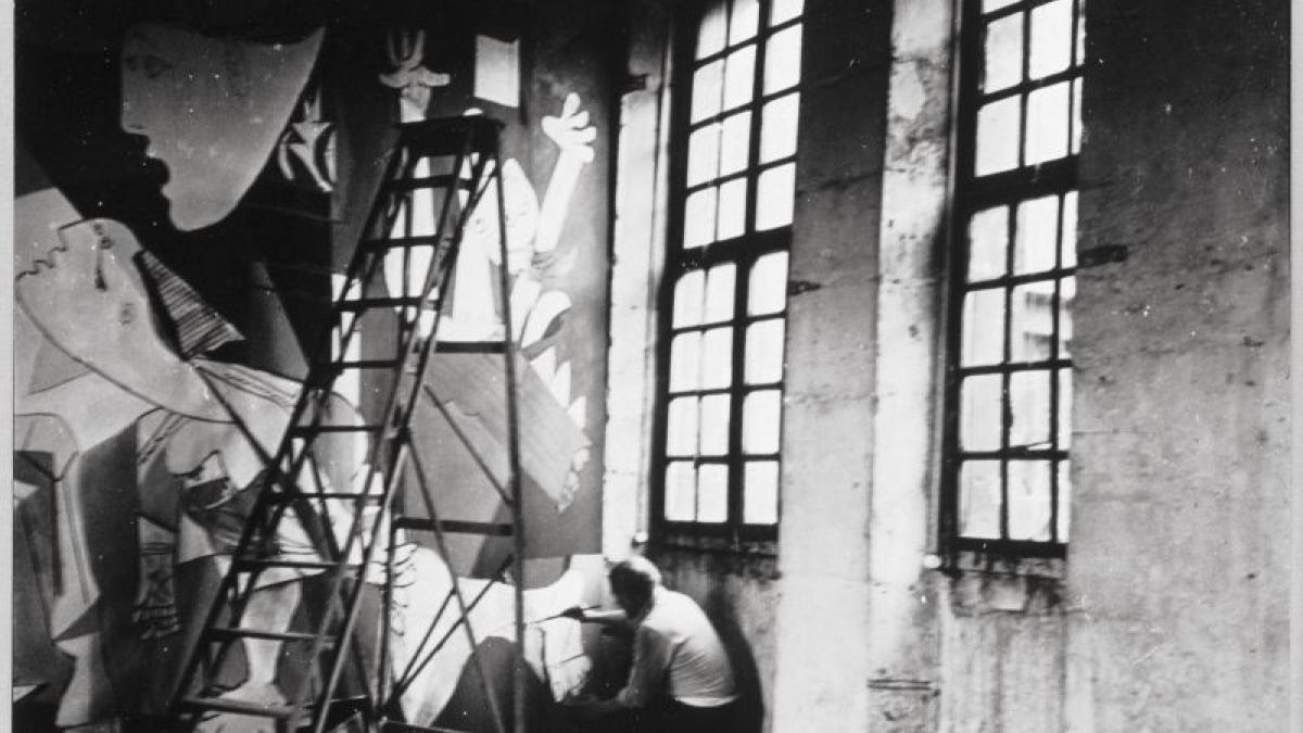 Picasso fotografiado por Dora Maar sentado en el suelo de su estudio trabajando en Guernica