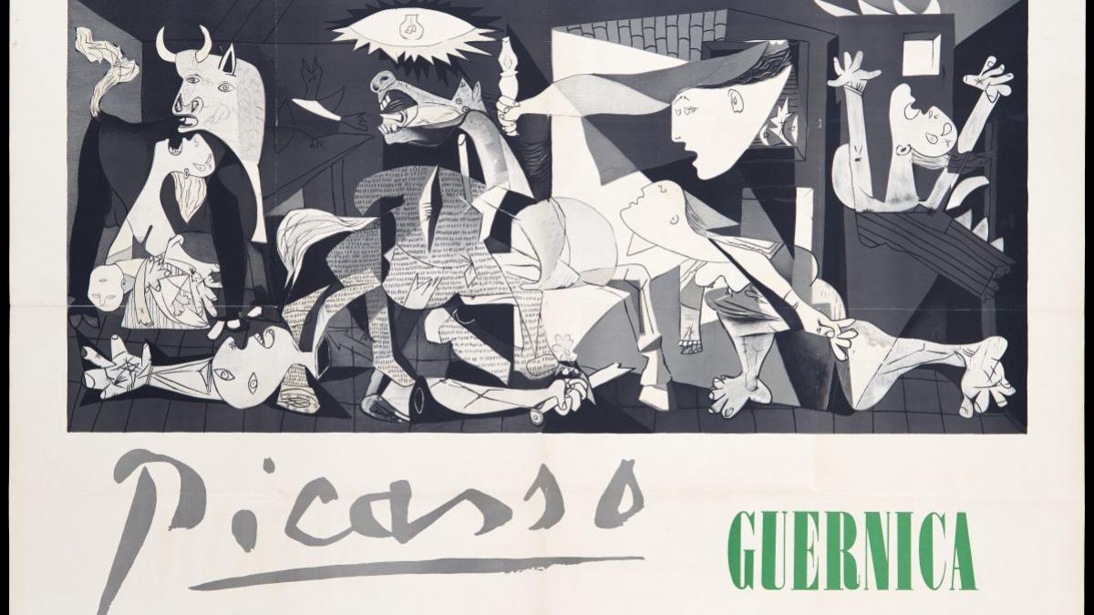 Cartel de la exposición Guernica, avec 60 études, celebrada en el Stedelijk Museum de Ámsterdam del 14 de julio al 30 de septiembre de 1956.
