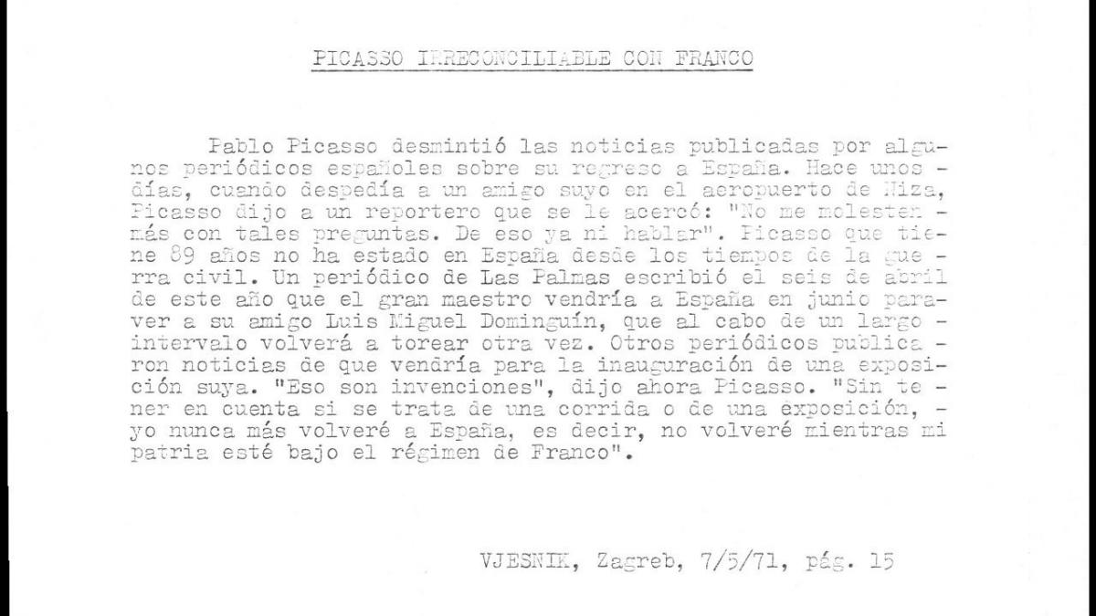 «Picasso irreconciliable con Franco», Vjesnik, 1971, p. 15.