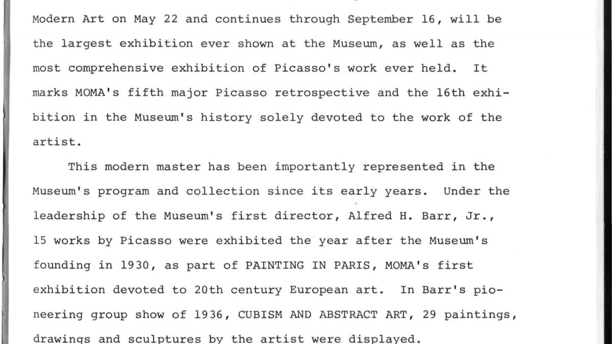 Nota de prensa del Museum of Modern Art de Nueva York sobre la exposición Pablo Picasso: A Retrospective.