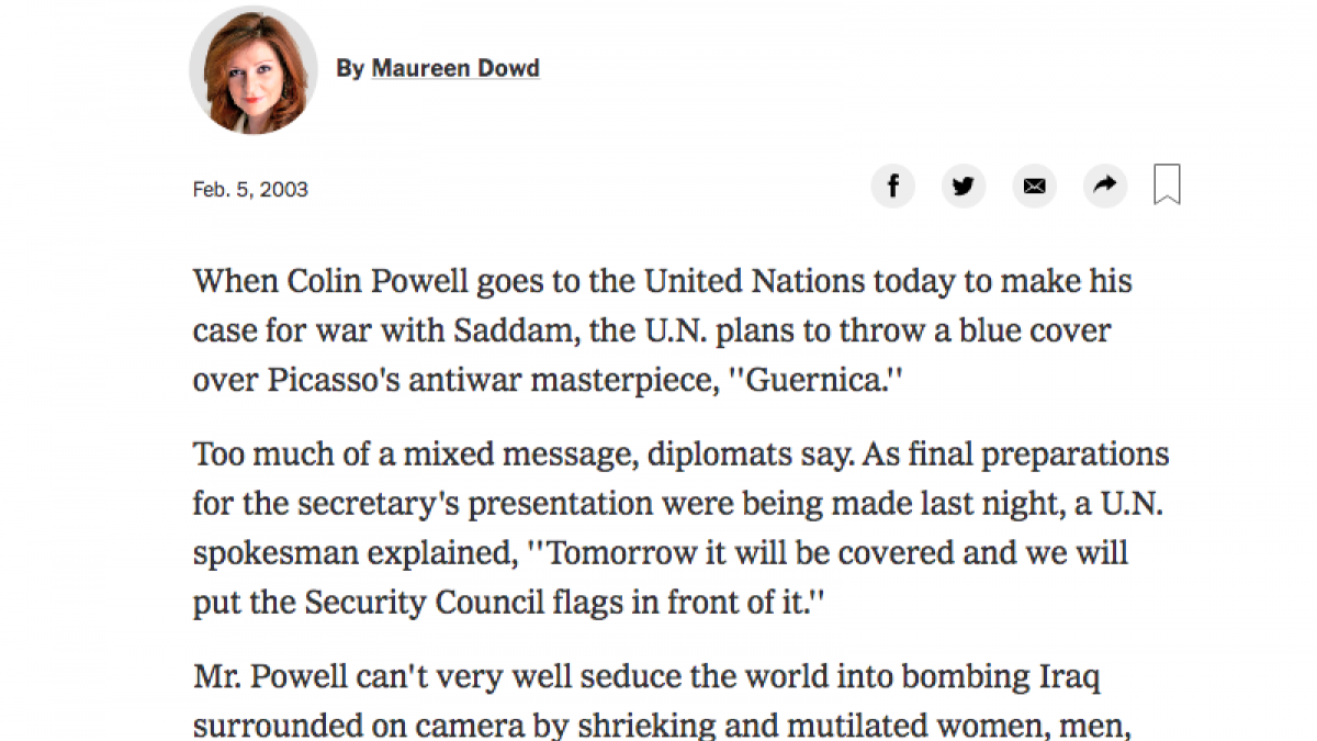 Artículo publicado inmediatamente después de que la reproducción en tapiz de Guernica situada en la antesala del Consejo de Seguridad de la ONU fuera cubierta durante los preparativos y la presentación del secretario de Estado Colin Powell sobre el caso “Estados Unidos contra Irak”, el 5 de febrero de 2003.