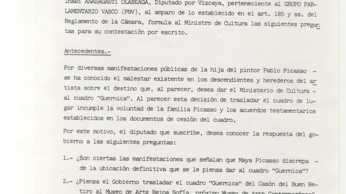 Preguntas en Registro del Congreso de los Diputados de Iñaki Anasagasti, diputado por el Partido Nacionalista Vasco, sobre el malestar de los herederos de Picasso por el traslado de Guernica del Casón del Buen Retiro al Centro de Arte Reina Sofía.