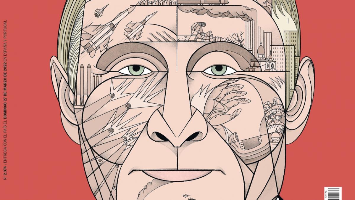 Portada para la revista dominical El País Semanal que muestra a Vladimir Putin con una máscara que describe la invasión de Ucrania. El rostro se conforma como un contenedor de historias en el que podemos apreciar toda la crudeza de la guerra. Las historias nos hablan de combate, muerte, refugiados, huida y miseria… Todo ello usando una base cromática basada en la bandera de la Federación Rusa.