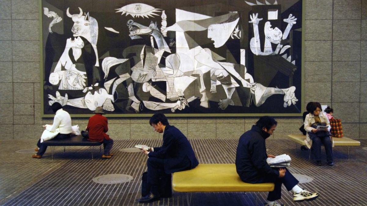 Un grupo de personas lee frente a la reproducción en cerámica de Guernica en la plaza del centro Marunouchi Oazo de Tokio una tarde de noviembre. La reproducción en cerámica fue realizada por la empresa Otsuka Ceramics Co., Ltd. Fiel al original, la tecnología de la compañía logra reproducir el color y textura originales que se puede preservar durante más de 2000 años.