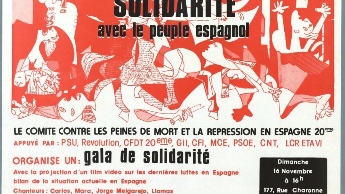 Solidaridad con el pueblo español. Cartel del Comité contra la pena de muerte y la represión en España por el que se anuncia gala de solidaridad para el 16 de noviembre de 1975.