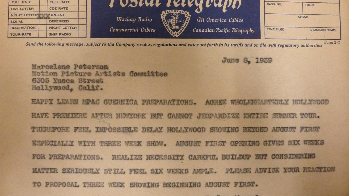 Marcelene Peterson, secretaria ejecutiva del sindicato Motion Pictures Artists' Committee, escribe a Evelyn Ahrend, directora de la Oficina de Programas de la Spanish Refugee Relief Campaign, aceptando las fechas de la exposición.