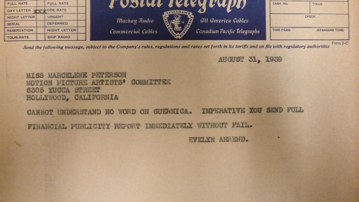 Evelyn Ahrend, directora de la Oficina de Programas de la Spanish Refugee Relief Campaign, pide a Marcelene Peterson, secretaria ejecutiva del sindicato Motion Pictures Artists' Committee, que le mande de inmediato el informe financiero de la exposición.