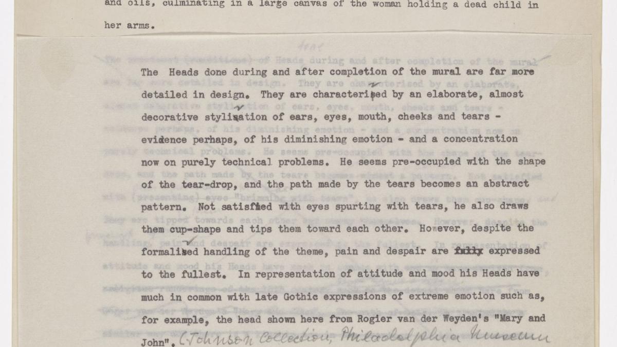 Documento con anotaciones preparado por el departamento de exposiciones itinerantes del Museum of Modern Art de Nueva York para la cartela de los proscriptos del Guernica en la exposición Studies for Guernica.