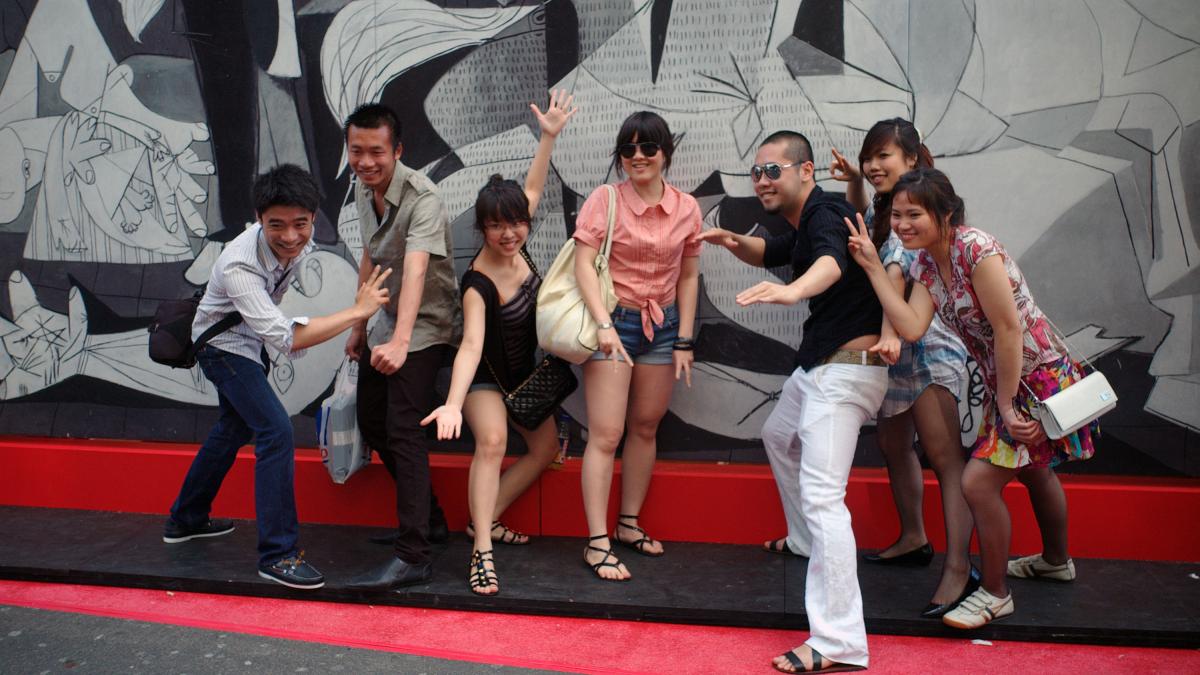 Un grupo de turistas posa frente a una réplica de Guernica durante el evento «A Taste of Spain»