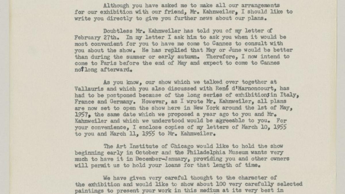 Alfred H. Barr Jr., director of the Collections Department at the Museum of Modern Art, New York, sends Pablo Picasso detailed information on the 1957 exhibition: works of interest, loans, etc.
