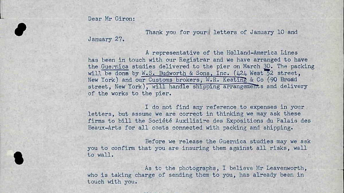 A copy of the letter sent to Robert Giron, director of the Palais des Beaux-Arts, Brussels, regarding the delivery of the paintings and the cost.