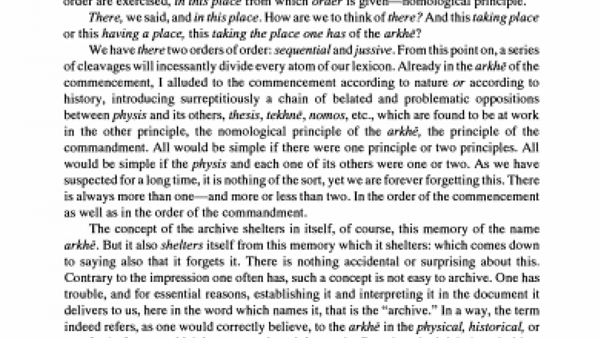 A classic text by the French intellectual Jacques Derrida. The “archive” is always incomplete and in a process of becoming, which is in tension with those official archives, constituted by a physical place, that are concerned with representational totality and institutional integrity. In the latter, institutionalised “archive fever” is connected to repetition-compulsion and a death drive. As there may be ideological biases or scotoma in official archives with reference to particular art works and/or documentation, the Left is often driven to archive its own practices and histories — for example Political Art Documentation and Distribution (PAD/D), founded by Lucy Lippard in 1979 — to alleviate the “blind spots” in official archives. However, in doing so these “alternative” archives are beset by their own archive fever demonstrating that the “archive” is both a necessary entity and an impossible project.