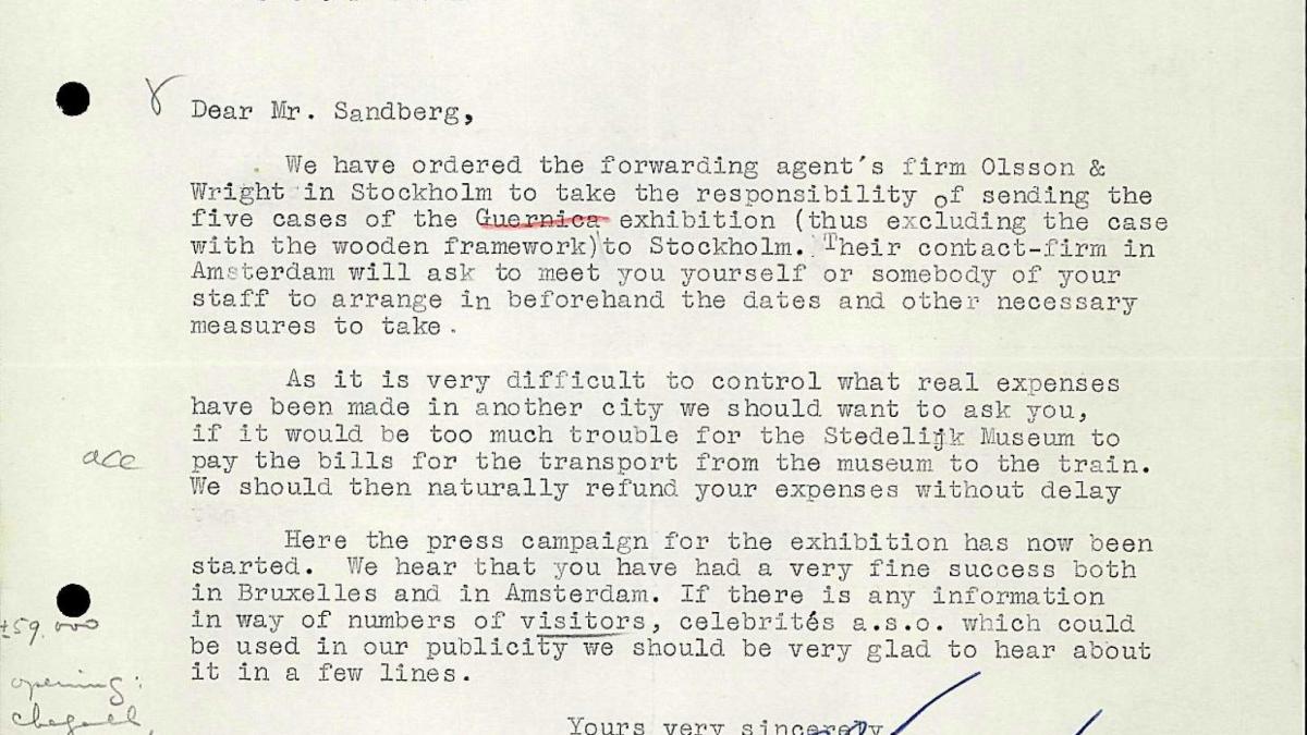 Bo Wennberg, head of the Modern Art Department at the Nationalmuseum, Stockholm, sends Willem Sandberg, director of the Stedelijk Museum, information on the delivery of the paintings to Stockholm, the costs, the start of the exhibition and the press campaign.