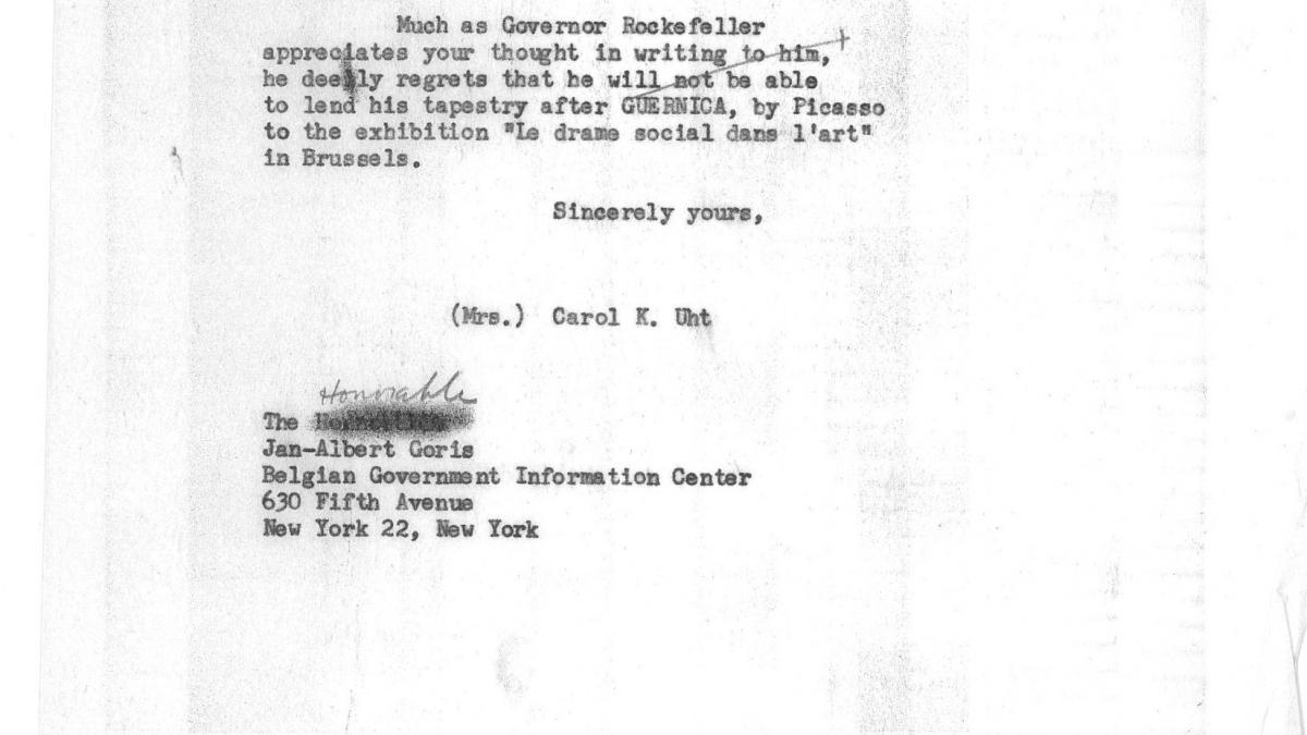 Carol K. Uht, curator of the Nelson Rockefeller collection, explains to Jan-Albert Goris, Belgian minister plenipotentiary and information commissioner, that the loan of the replicaGuernica tapestry will not be possible for the exhibition Le drame social dans l'art at the Palais des Beaux-Arts, Brussels.