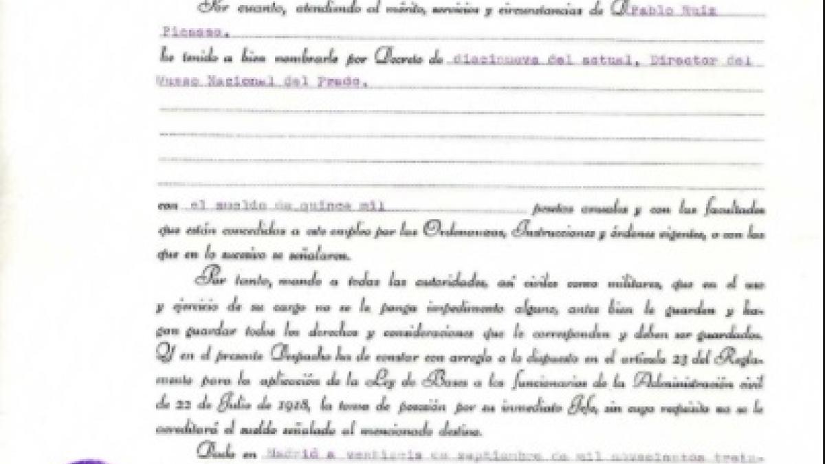 Certificate of appointment for Pablo Picasso as director of the Museo Nacional del Prado