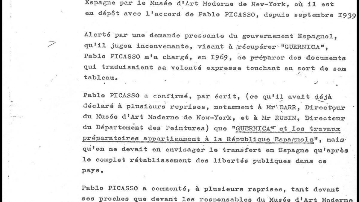 Roland Dumas, the legal executor of Pablo Picasso's will, writes to inform that, despite the advances, Spain does not yet have a fully democratic regime, which means the transfer of Guernica must wait.