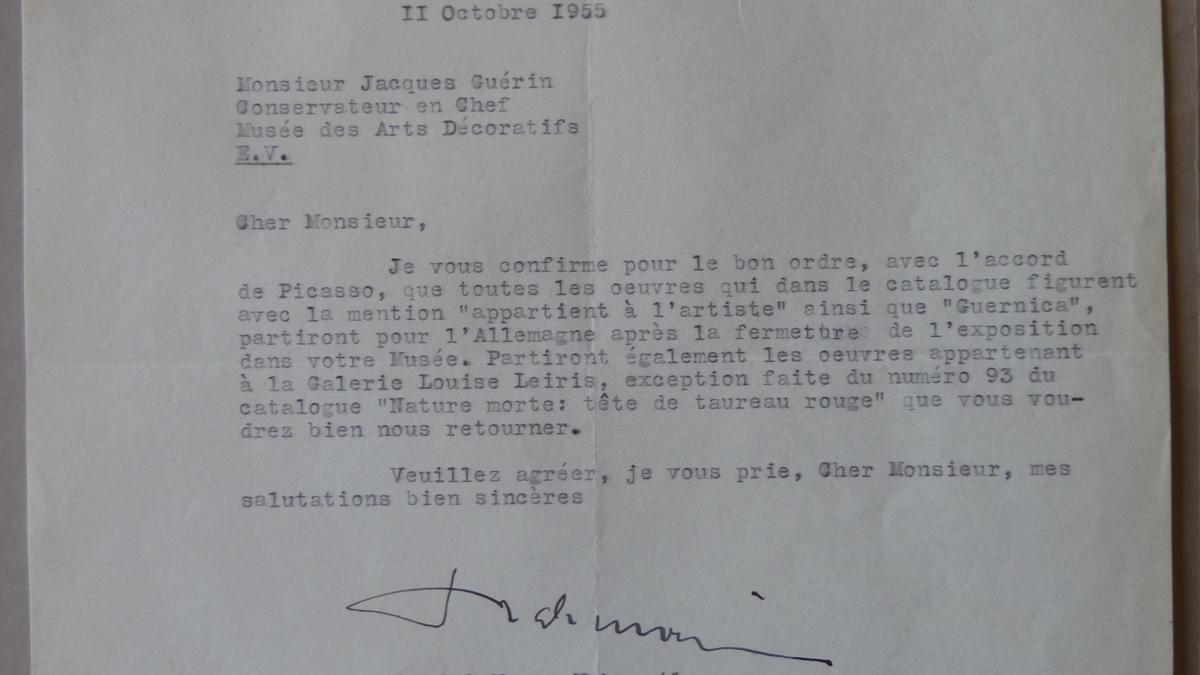 Daniel-Henry Kahnweiler sends confirmation to Jacques Guerin, director of the Musée des Arts Décoratifs, Paris, that the works from the exhibition will travel to Munich.
