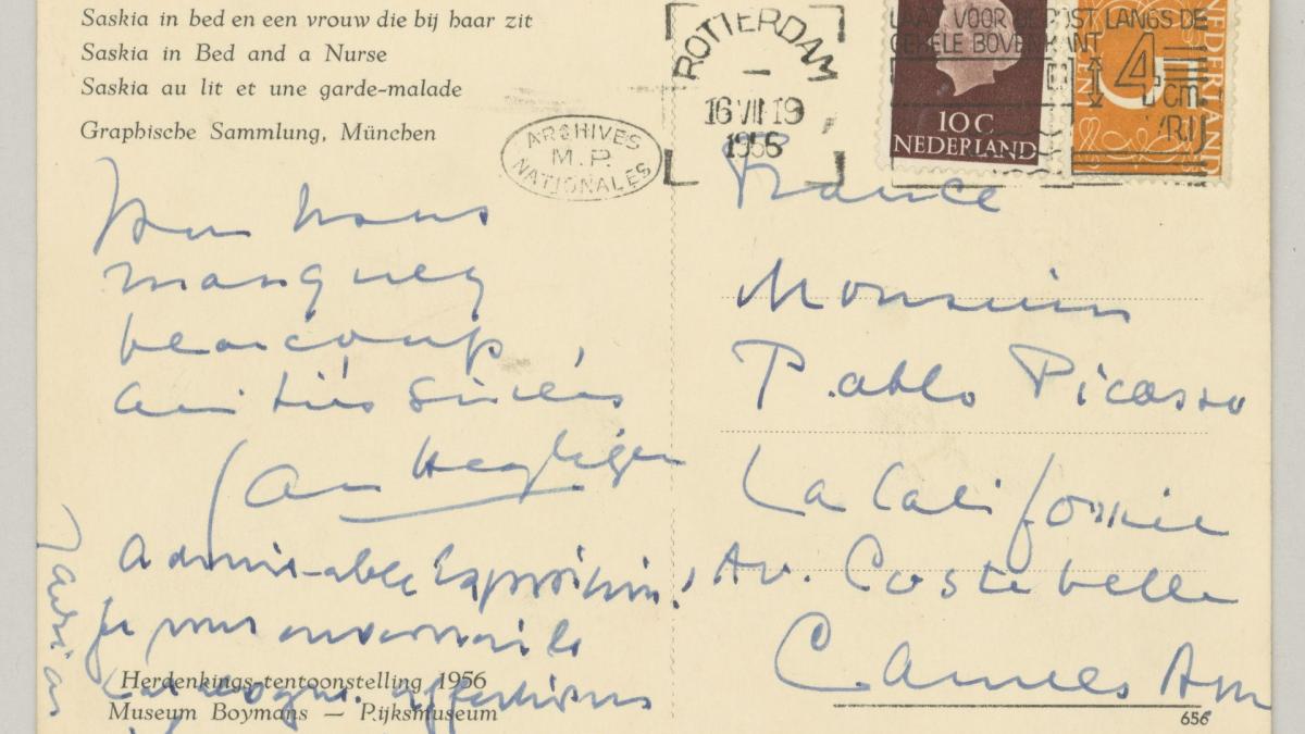 Daniel-Henry Kahnweiler sends a postcard to Pablo Picasso with a work by Rembrandt and talks about the opening of the exhibition.